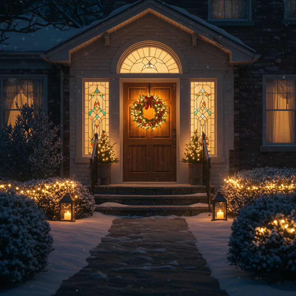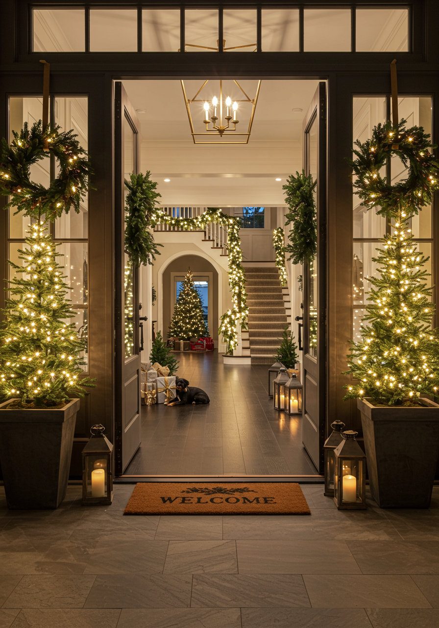 Your home’s entryway sets the tone for the entire holiday experience. For luxury homes, start with a grand statement at the front door. A beautifully crafted wreath with lush greenery, metallic accents, and ribbons instantly creates a festive atmosphere. Add oversized urns filled with pine branches, berries, and twinkling lights to frame the entrance.